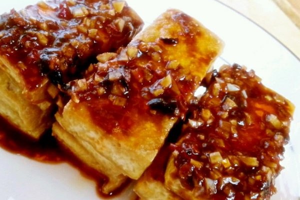 炒香蒜蓉、豆豉香辣酱浇在豆腐上