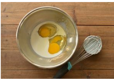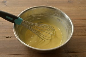 取大盘,将鸡蛋敲入,加入细砂糖、蜂蜜、牛奶、盐、玉米油等材料,用蛋抽搅拌均匀