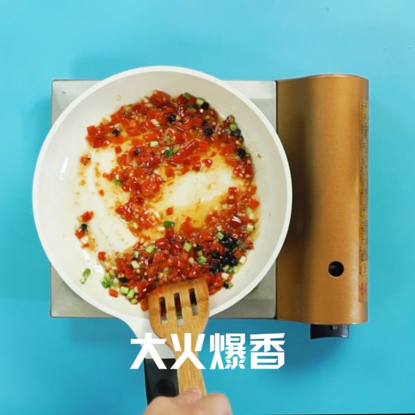 倒入花生油、放入剁椒,豆豉、葱末、姜末、蒜末,大火爆香