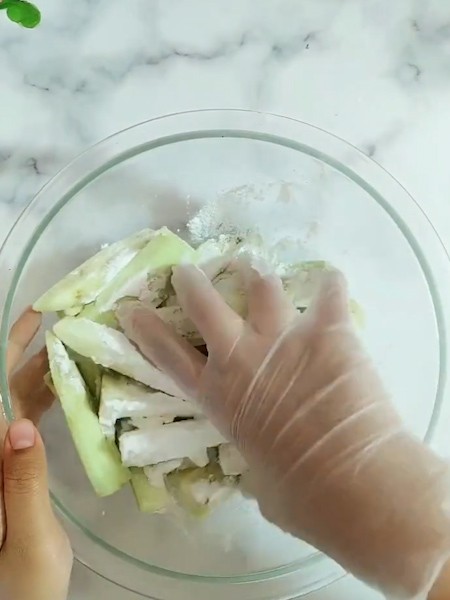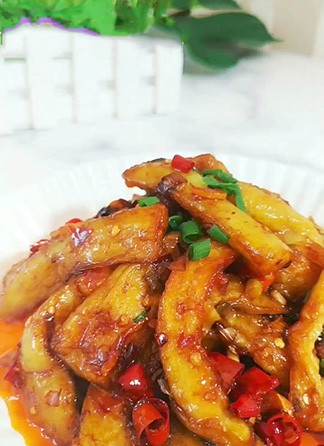 倒入炸好的茄条,加入生抽,醋,糖,翻炒均匀。