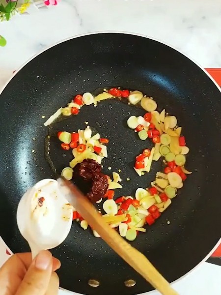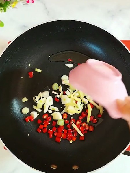 锅中放油,倒入葱,姜,蒜,小米辣炒香。