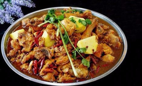 大盘鸡是新疆地区名菜,大约起源于80年代后期,主要用料为鸡块和土豆,配...