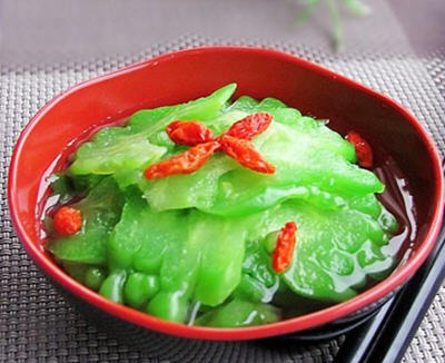 苦瓜焯烫加点盐,即可保持颜色碧绿也能减轻苦瓜的苦味。 此道菜冷藏后食用口感更佳。