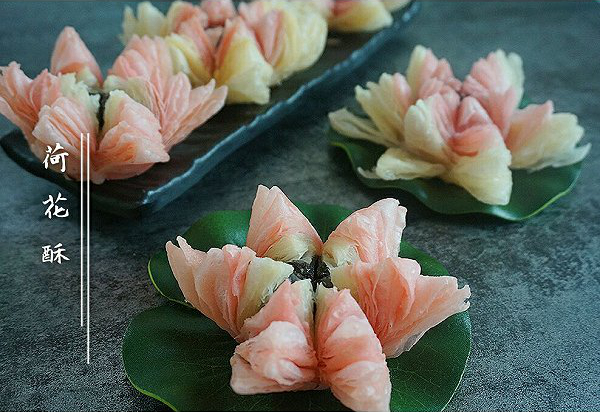 浙江杭州著名的传统小吃。以油酥面制成,形似荷花,观之形美动人,食之酥松香甜,别有风味。