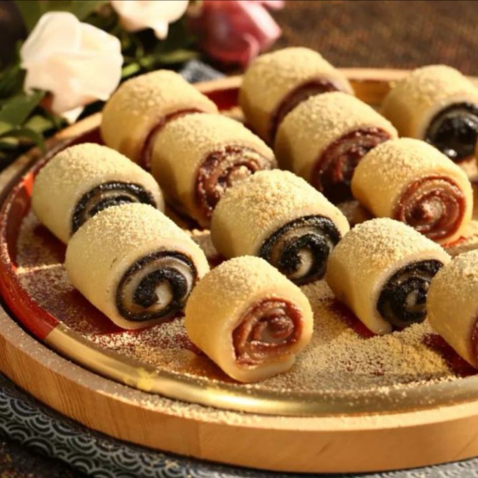 驴打滚是老北京传统小吃之一,成品黄、白、红三色分明,煞是好看。因其最后制作工序中撒上的黄豆面,犹如老北京郊外野驴撒欢打滚时扬起的阵阵黄土,因此而得名“驴打滚”。“驴打滚”的原料有大黄米面、黄豆面、澄沙