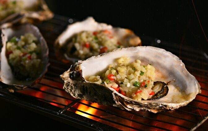 烤生蚝是沿海地区的特色小吃,是用新鲜生蚝通过炭烤而成。烤生蚝的做法非常简单,只需将蒜蓉、姜末、酱等佐料放入刚刚撬开的生蚝内,再直接放到火上烤熟即可,最大限度地保证了蚝肉的新鲜还增加了蚝的野味感觉 。