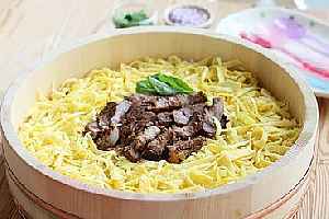 原料:梅花肉500g,卤水汁3大勺,姜6片,香油适量,鸡蛋5个,糖1小勺,盐适量,米饭300g左右