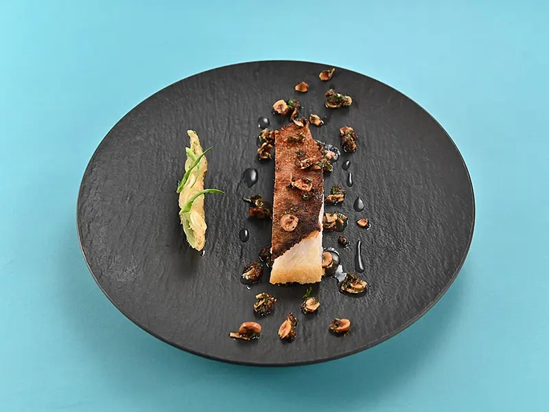 Quintessence 的烤鱼方法特点就是将大块的鱼肉烤后再切。之前说过的鰆鱼(蓝点马鲛)和这次的石斑也都是这种料理方式,保留大块肉身而减少受热的面积,虽然烤制充分,但是切开的横截面上完全不存在烤痕