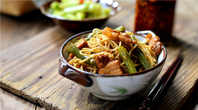 关火后用筷子将面条和肉豆角拌匀即可。