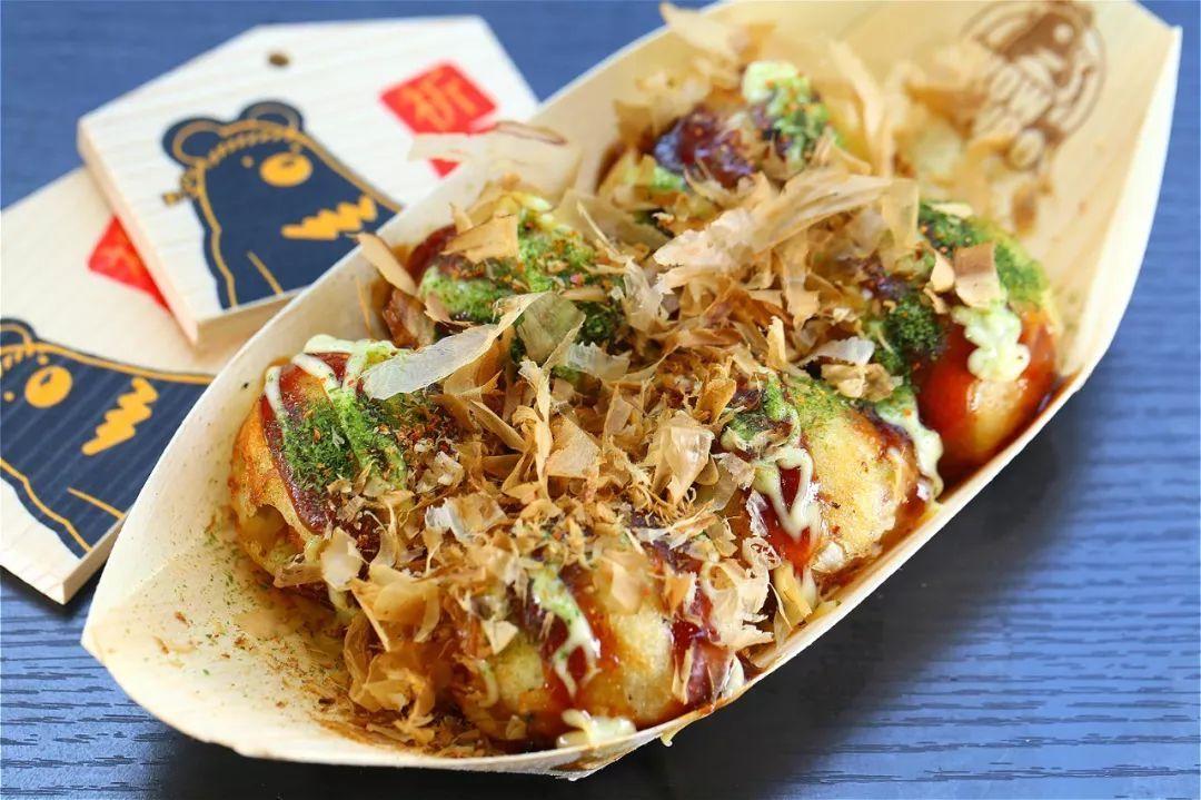 6.丸子变色并且表面有硬嘎后就差不多熟了,用签子取出来,挤上番茄沙司,沙拉酱,照烧酱,再撒木鱼花和肉松就可以吃了。