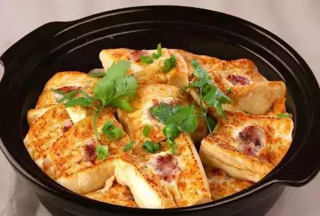广东是个客家人大量聚集的地方,客家的酿豆腐煲也在广东深受喜爱,香煎过的豆腐配合其上的猪肉馅,非常下饭