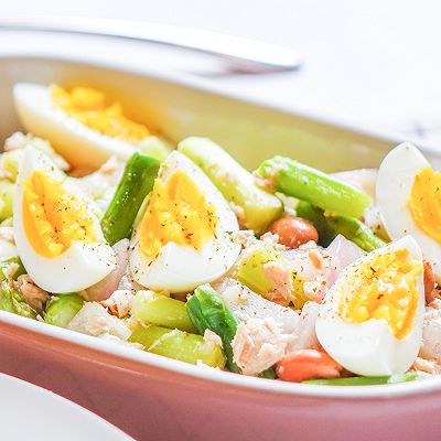 用料:鸡蛋、芦笋、吞拿鱼、红洋葱、白芸豆、柠檬汁、橄榄油
