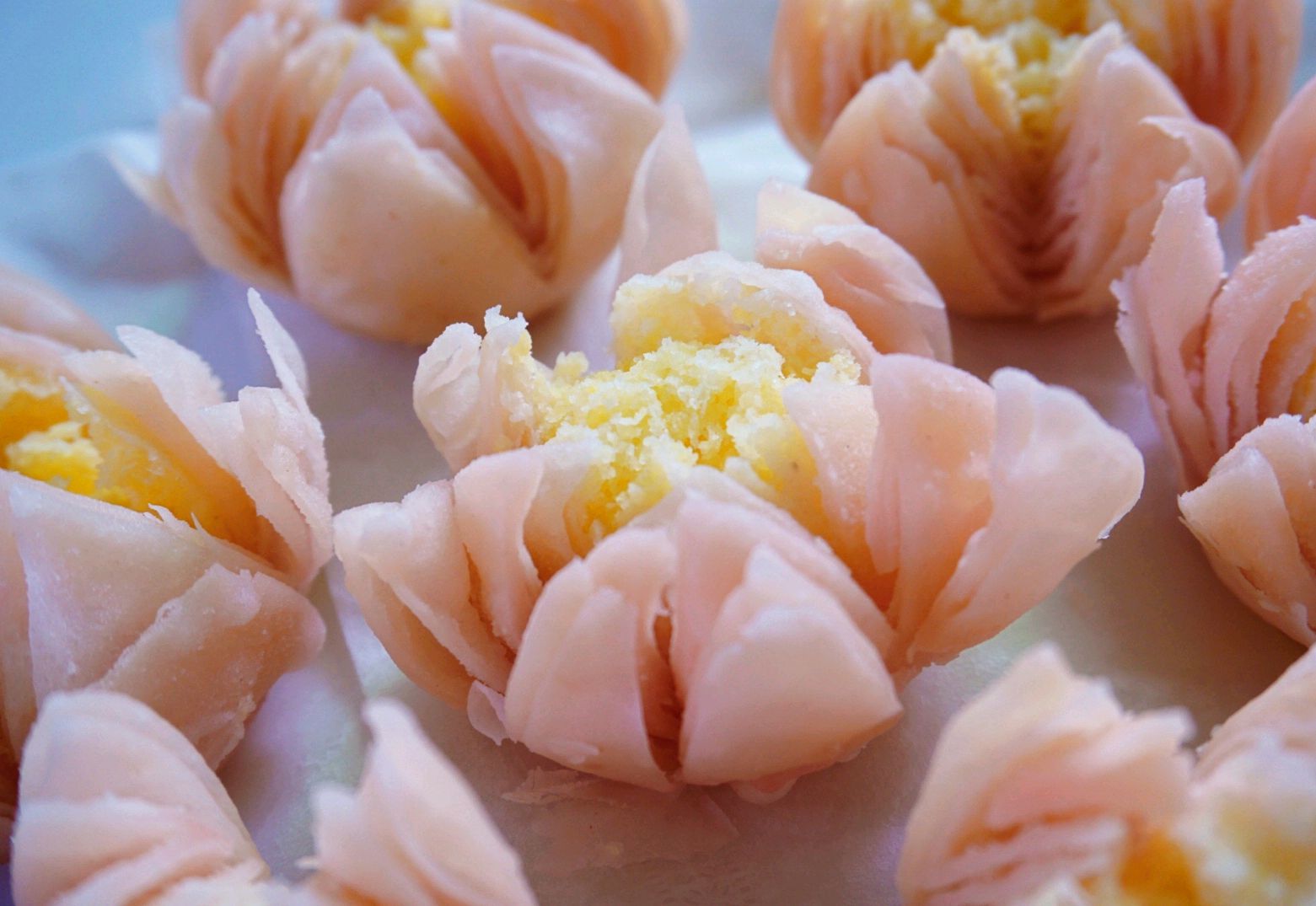 将提取过奶油的淀粉凉干,用磨磨成粉末,拌入黄油、白糖、人参果、桃仁、葡萄干等,做成圆形或方形,表面有红丝绿丝的表现吉祥、长寿图案的醍面胚,放入笼屉内蒸熟,奶味甜点,有滋补强身功效,为藏胞待客糕点。