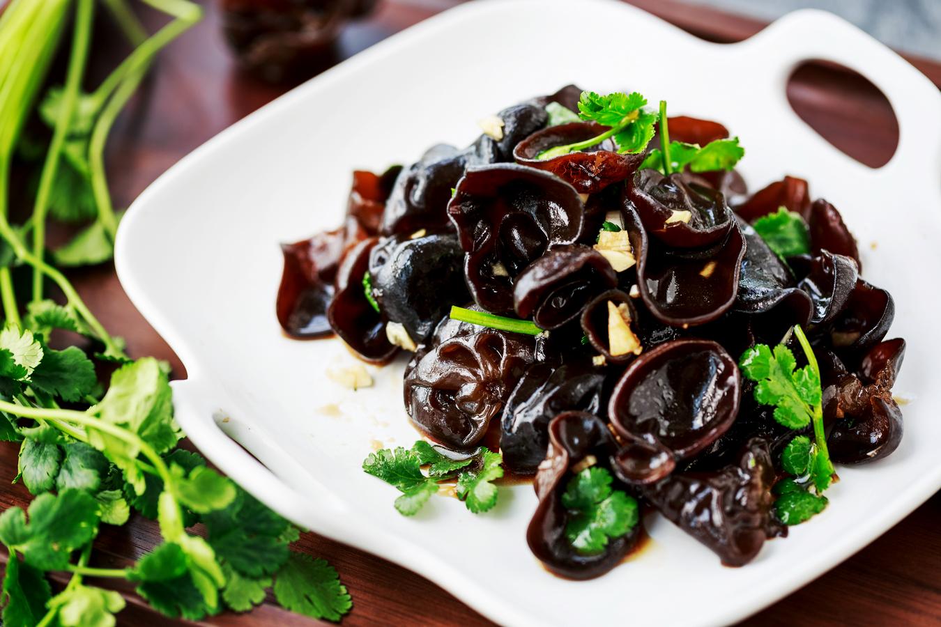 凉拌黑木耳:黑木耳15克、盐3克、醋10克、大蒜,白糖5克、生抽5克、香菜适量